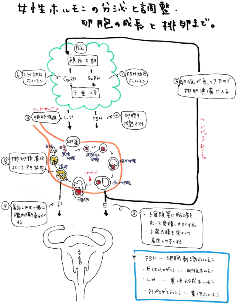 卵胞の成長と排卵は、脳の下垂体という部位から分泌されるホルモンにより調整されています。PCOS では、この下垂体から分泌される【黄体ホ 形成 ルモン ( 】 が過剰に分泌され、 排卵がうまく行われなくなります。