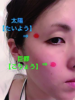 こめかみから目尻に向かったところのくぼみ 押して気持ちいと感じるところ。